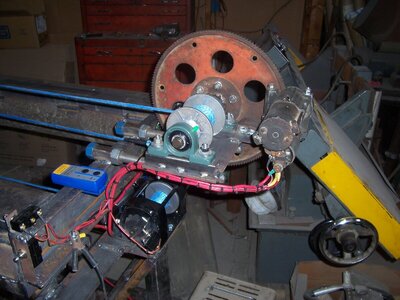 Hi everybody I'm new to this forum. I'm building a log cutter as I'm too old to run a chainsaw like I used to. I run a small manufacturing business and heat my shop mainly with wood. A couple of years ago I had 10 big oak trees taken down that were too close to my house and I kept all of the logs and limbs probably enough wood for at least 3 Winters but it all needs to be cut into firewood size pieces. So I decided to build a machine to make it easier. I'm using a Stihl 034 chainsaw, a air over hydraulic system to move the saw, 2 12v winches to move the log cradle, 1 4000 lb. to move the log forward and a homemade winch to move the cradle back. The chainsaw is moved by a 2.5" bore cylinder that I built that connects to the primary tip plate, the chainsaw is mounted on a secondary plate that hinges on the primary so only springs apply pressure to the saw. when the springs stretch about 2 inches the secondary plate trips a limit switch that closes a solenoid valve shutting off the oil to the cylinder. When the saw finishes its cut it trips another limit switch that shuts off air to the throttle air cylinder, closes the oil in valve, opens the oil out valve, opens the air valve that applies air to the top of the cylinder to raise the saw up. Another limit switch switches the air off to the cylinder when the saw is in its up position, The log is moved ahead for the next cut and a switch on the control box starts the next cut. The saw has a 20" bar so it will cut through a 19" diameter log. The winch that moves the log forward has a wireless remote so I can set the log on the front roller and then bring the log cradle ahead under the back of the log from inside my skid loader.
